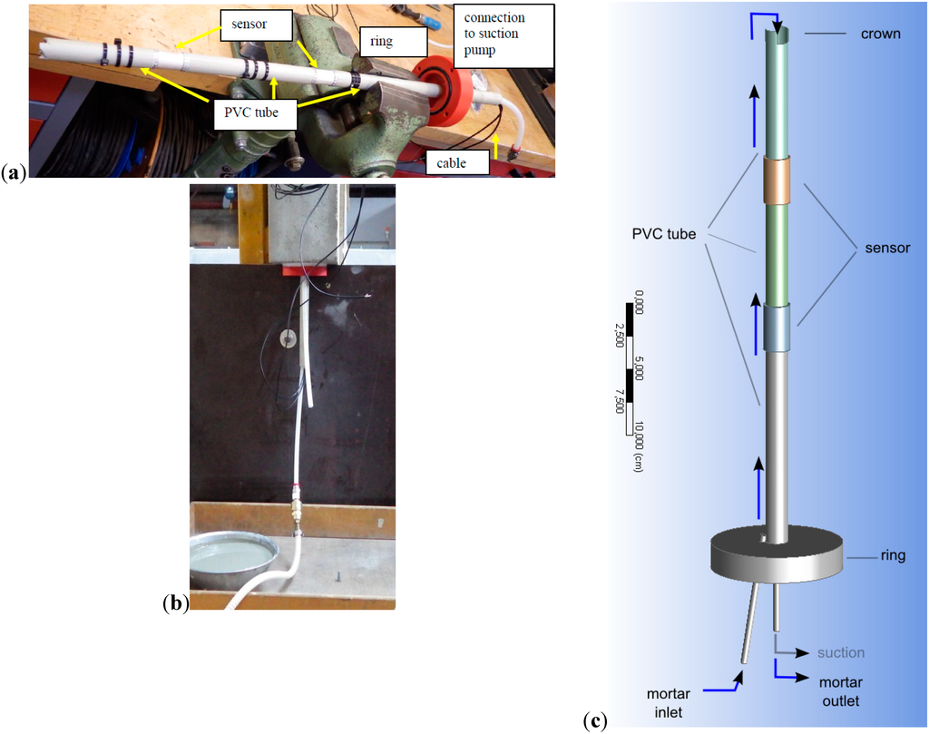 For existing structures we have developed a method to install one or several transducers at the required depth(s) in a drill hole and ensuring sufficient coupling to the concrete. The hole is drilled with a slightly larger diameter than the transducers and slightly deeper than the installation depth. The transducer(s) and the tube segments are connected with a sealing cap to the structures’ surface (Figure 3). The cap contains an inlet, which is connected to a (liquid) grout reservoir and to the space between the transducers/tubes and the concrete. By connecting a suction pump via an outlet in the cap to the inner hollow space of the transducers and the tubes the grout is sucked into the drill hole and via the crown of the tubes into the inner space (Figure 3c). When the grout appears at the outlet we can be sure the entire space is (at least almost) filled and the transducers are coupled to the concrete. We are using a fast hardening, slightly expanding type of grout.