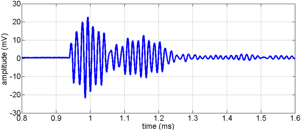 The transducers have been characterized by some basic experiments. First, two transducers of the same type have been installed back to back directly without any medium in between to evaluate the frequency spectrum. A short impulse (t = 2 µs) was used as input. The signal recorded by the transducer is displayed in Figure 4. The signal recorded shows a wavelet with about 20 periods and a total duration of ca. 0.3 ms. The reverberations show a lack of damping of the piezo material. As we don’t intend to use the transducers for imaging applications, where a sharp response (broadband in frequency domain) would be more beneficial, this behavior is fully satisfactory.