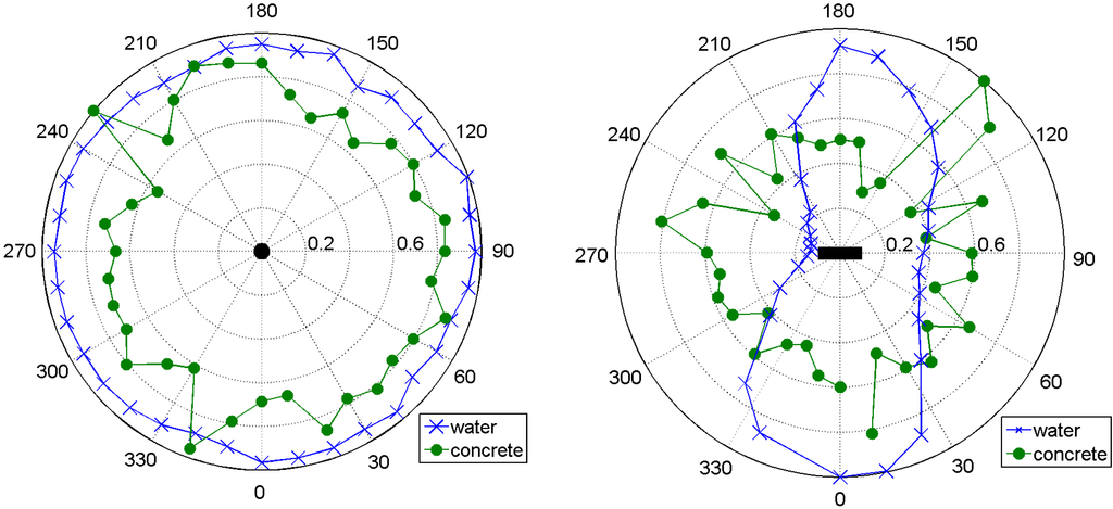 For horizontal transmitter orientation (left in Figure 7) the directivity pattern in water resembles something close to a number eight. Apparently (and not unexpectedly as applying a voltage to the cylindrical piezoceramic leads mainly to changes in diameter, not in length) the amplitudes emitted in the direction of the transducer’s rotational axis are much smaller than in the perpendicular direction. The experiment with the same configuration in concrete showed that the amplitude is similar in all directions (but has significant variation). Our interpretation is that due to scattering at the concrete’s aggregates, pores and cracks, the directivity pattern is somewhat equalized.