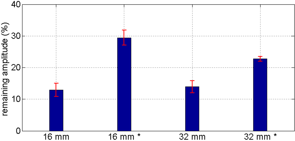 Amplitude ratios between near and far receivers in the attenuation experiment for the two specimens (16 and 32 mm max. aggregate size). The * marks values for transducers installed after concreting.