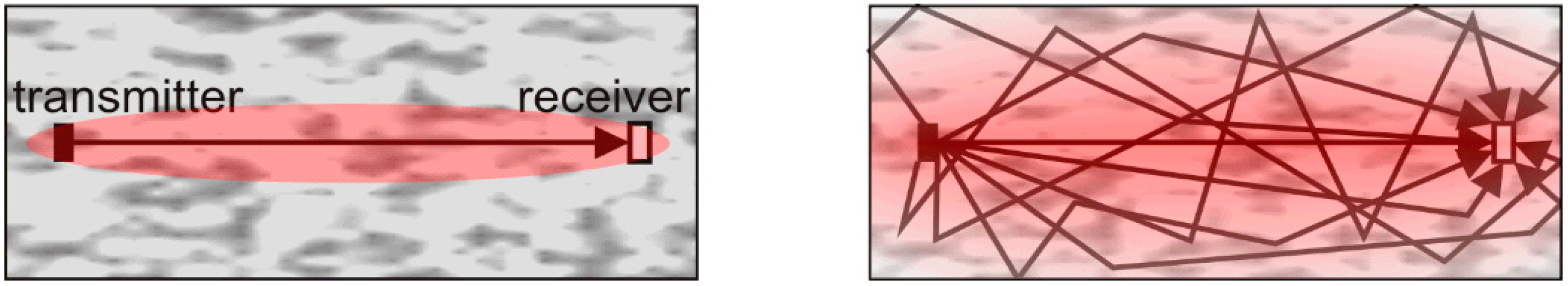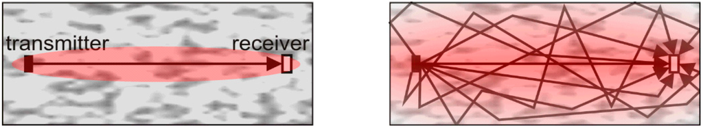 Traditional time of flight measurements are considering direct waves only (first arrival at the receiver in most cases). The area of influence is limited to a narrow band (“first Fresnel zone”) between transmitter and receiver (Figure 9 left).