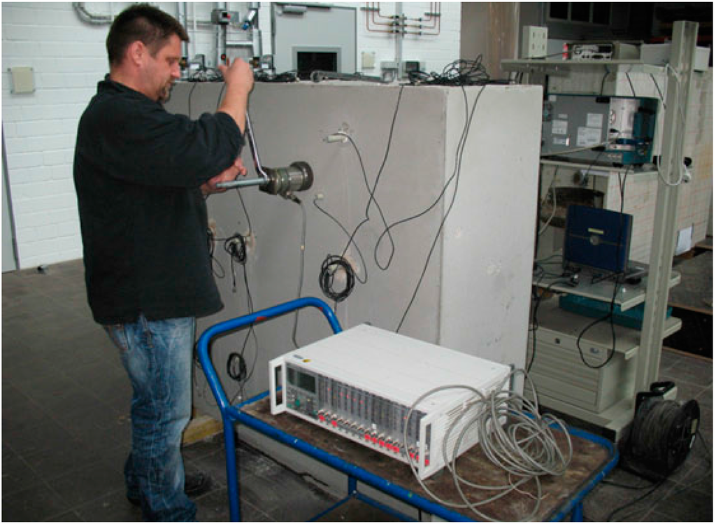 The embedded transducers have been applied in two other fields of applications so far. In several experiments we have used them to instrument concrete lab samples (typical size 15 × 15 × 40 cm3). These samples have been put into climate chambers or CDF test devices to evaluate the influence of temperature [16] and moisture on ultrasonic data. This evaluation is required in real world monitoring application as the influence of loads or deterioration is often covered by environmental influences. Instrumented lab samples may also be used in CDF test for freeze thaw resistance evaluations. The measurement of ultrasonic pulse velocity is already part of these evaluations, but the samples have to be removed from the CDF test chambers so far. Embedded transducers would make these tests much easier.