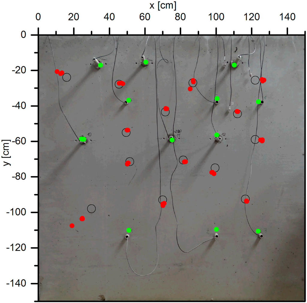 In a second set of experiments pencil breaks on the specimen’s surface (a commonly used test for AE systems according to ASTM E976) have been used. Again, the experiments have been repeated three times at points marked by circles in Figure 12 and the events have been recorded and evaluated using the AMSY6 system. The localization (red dots in Figure 12) in areas with good transducer coverage lies on the mark ±3 cm. Those events outside the transducer array were not located accurately.
