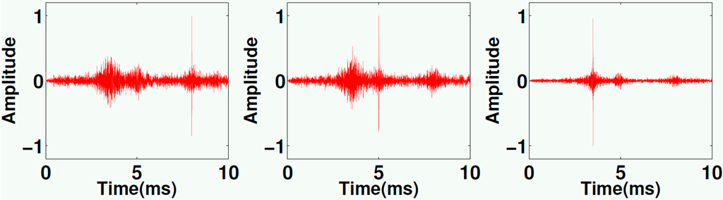 Backpropagated signals recorded at the three embedded transducers. Note the sharp peaks at specific times for each transducers reflecting perfectly the original time and place of the acoustic events, with permission from [33].