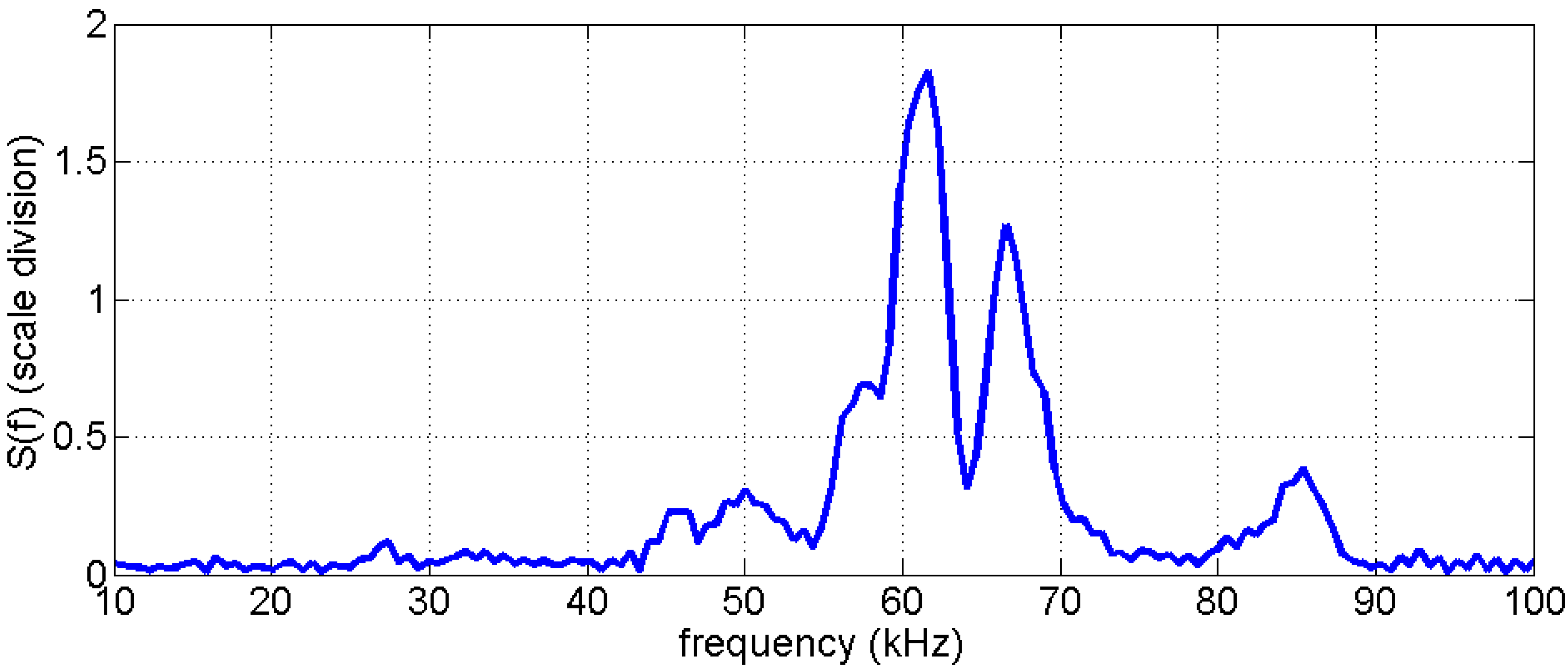 The amplitude spectrum of the data of Figure 4 is shown in Figure 5. There is a prominent frequency peak at 62 kHz and a significant second one at 65 kHz. Smaller peaks appear around 50 and 85 kHz. There is no significant energy with frequencies lower than 40 or higher than 90 kHz.