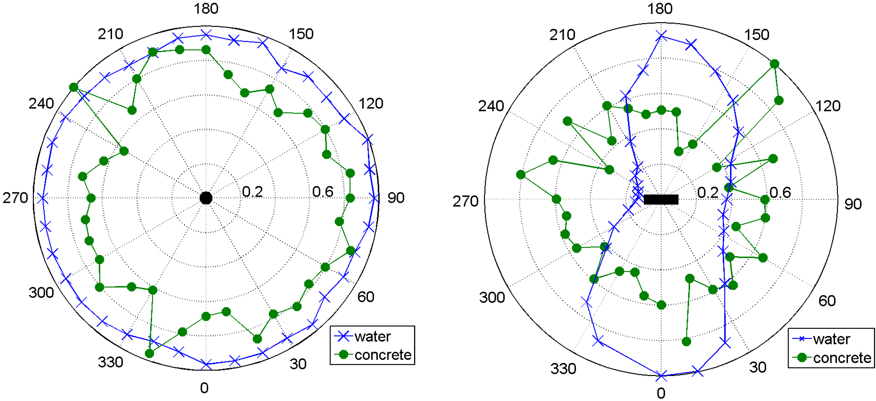 Directivity patterns for the new transducer, measured in water (blue crosses) and concrete bodies (green dots). (Left) vertical orientation; (Right) horizontal orientation. Axis from center to perimeter: relative amplitude. Seen from above.