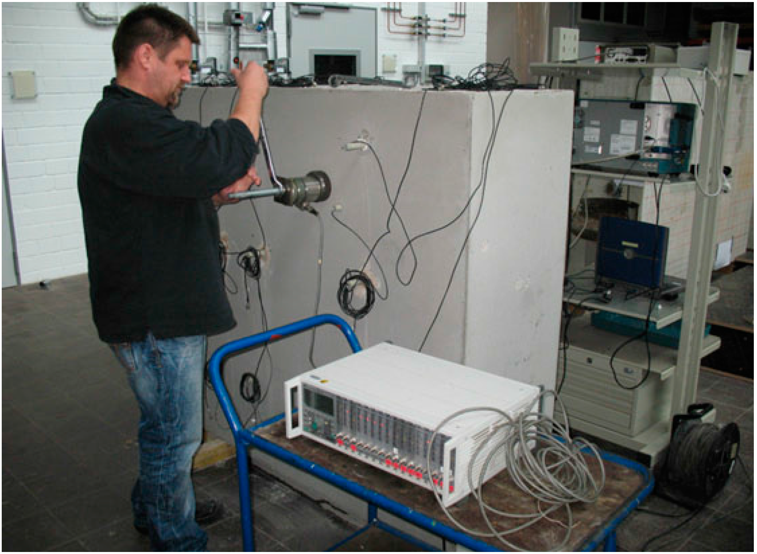 - British Standards Institute (BSI). Testing Concrete in Structures. Determination of Ultrasonic Pulse Velocity. BS EN 12504-4:2004 (equivalent German version: DIN EN 12504–4:2004. Available online: http://shop.bsigroup.com/ProductDetail/?pid=000000000030102823 (accessed on 24 April 2015).