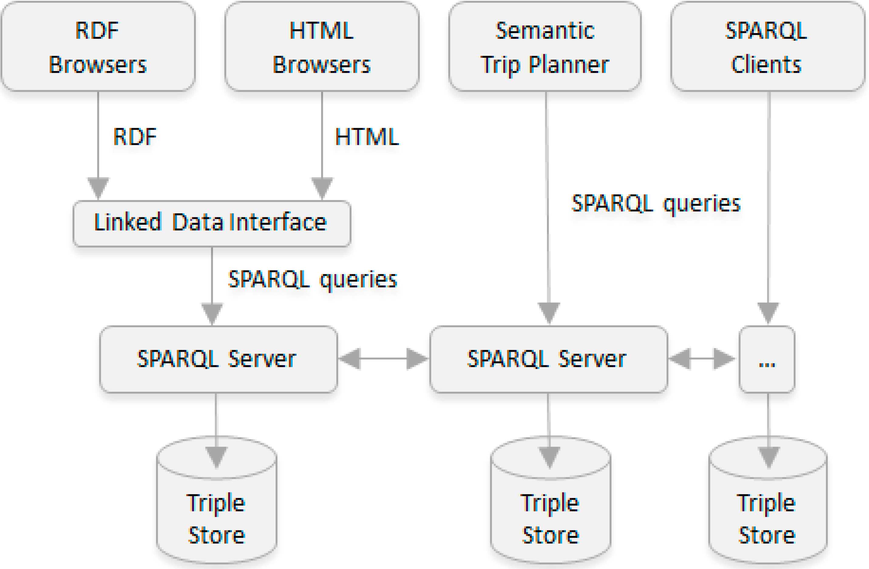 - Transport Information Clients. Different types of clients (RDF browsers, HTML browsers, SPARQL clients, etc.) that can request the transport information provided by the system, including the semantic trip planner developed in order to validate the architecture (further described in Section 5).