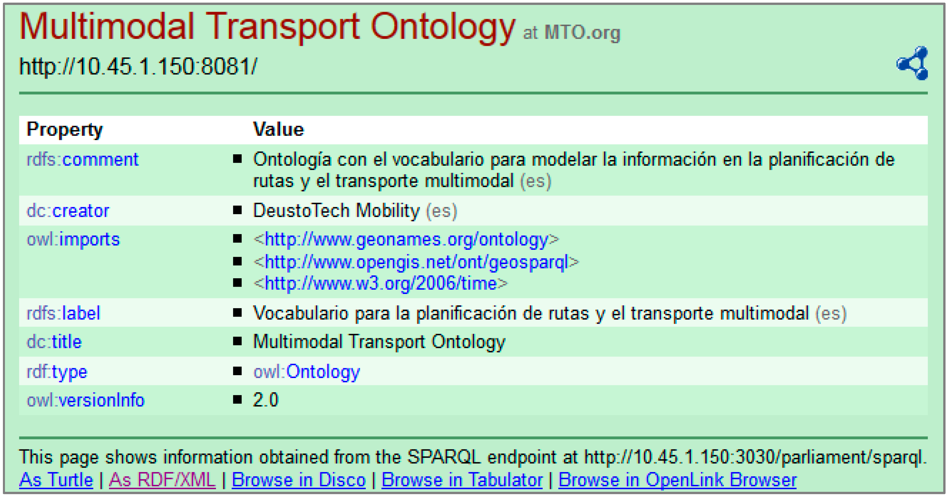 - Transformation of non-ontological resources: establishment of entities, properties and constraints generating unique indexes for each transit agency and conversion of specific individuals from CSV files.