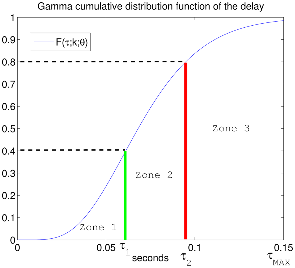 The next step is the selection of the gamma probability parameters that models the network delay τ, as can be seen in Section 3.1. The values of τ are classified into three zones (L = 3) bounded by the values of its gamma cumulative distribution function Γ(τ), as can be noticed in Figure 1: τMIN = 0.005 s, τ1 = 0.061 s, τ2 = 0.095 s and τMAX = 0.15 s. Then, the three ranges of network delays are discriminated by: