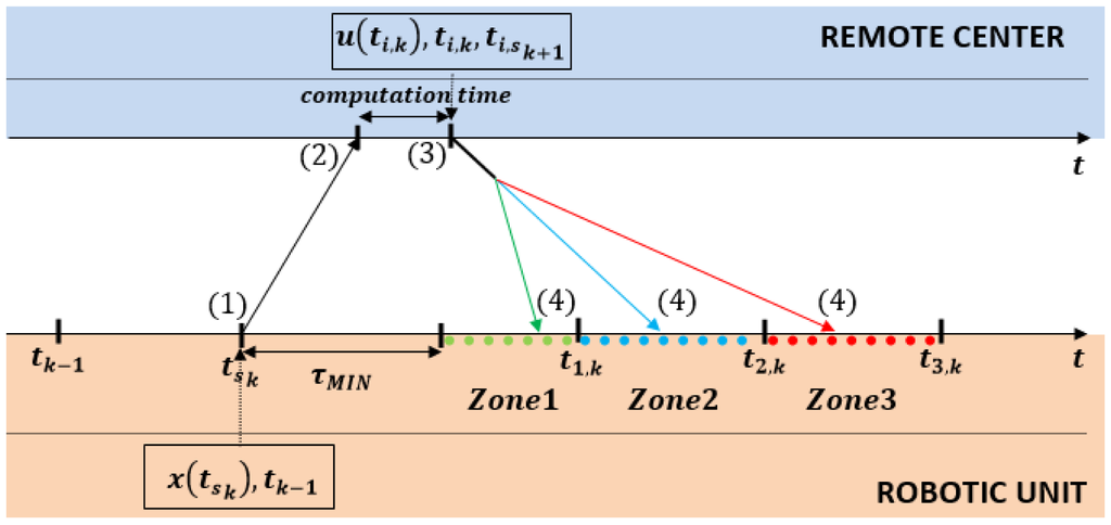 At time tsk the robotic unit sends its measurements x(tsk) and the last update time tk−1 to the remote controller.