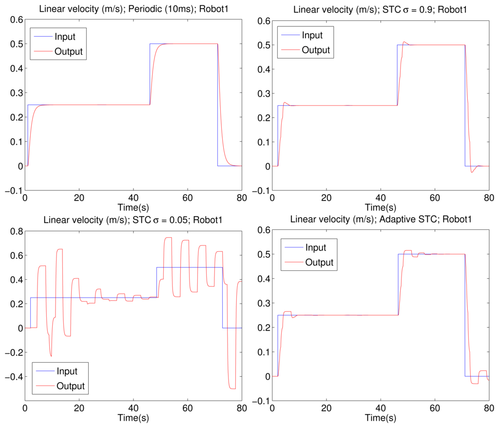 Figure 7 shows the linear velocity that is the first component of the output vector y(t) from one of the four tested P3-DX robots. The top-left picture corresponds to a fixed sampling time of 10 ms, which shows good tracking performance. The top-right figure displays a high-performance self-triggered implementation (σ = 0.9). The bottom-left illustration depicts a low-performance self-triggered implementation (σ = 0.05). The bottom-right picture describes the adaptive self-triggered solution. It can be appreciated that the higher the value of cr, the better the servo control performance. Nevertheless, the adaptive self-triggering solution presents a balanced solution with a lower number of channel access and an acceptable control performance. The same behavior is observed for the tracking of the angular velocity that is the second component of the output vector y(t), which for the sake of space, is omitted from the paper.
