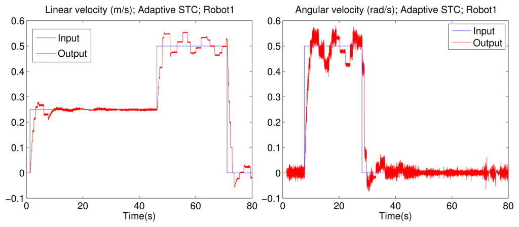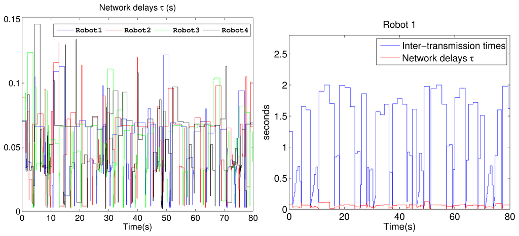 The linear and angular velocities from one of the P3-DX units with the adaptive aperiodic implementation are shown in Figure 8. It can be appreciated that the adaptive self-triggering solution presents an acceptable control performance quantified by the ISE value related to each robot control. The tracking error and the number of transmissions through the network are quantified in the “adaptive STC” of Table 4. Figure 9 shows the current network delays and the inter-execution times τ obtained from the experiment with four robotic units. The picture on the left confirms the erratic behavior of delays in a WiFi channel. The picture on the right shows the inter-execution times and the network delays for Robot 1. As can be appreciated, the higher the network delay, the higher the inter-transmission times and vice versa. This way, the proposed controller actively and dynamically contributes to optimizing the channel availability for control or other shared applications among several nodes.