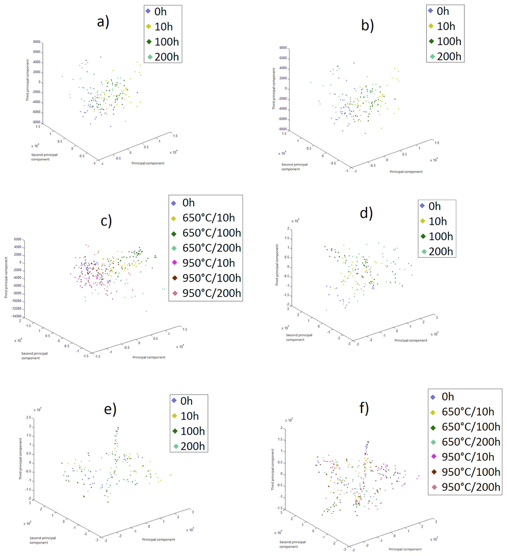 Figure 1 shows the PCA (principal component analysis) corresponding to the spatial distribution of the samples of the 4-MHz backscattered signals at 650 °C (Figure 1a), 950 °C (Figure 1b) and both temperatures together (Figure 1c), as well as for the background pulse echo signals for 650 °C (Figure 1d), 950 °C (Figure 1e) and both temperatures together (Figure 1f). Accordingly, it is possible to analyze the complexity during the difficult assignment of classifying the samples.