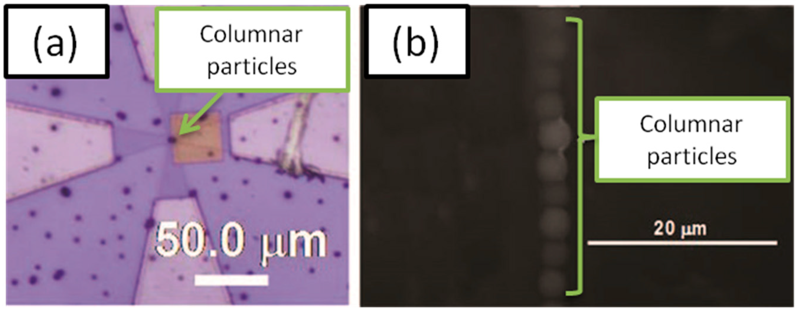 Figure 13a–h show a series of images taken with an optical microscope showing 2.8-μm-diameter superparamagnetic columnar particles being manipulated by the electric field in microchannels. They are seen to self-assemble on a spot onto which the 130-nm-diameter target beads are immobilized in the application of the external magnetic field, before starting to flow through the microchannels in the absence of the external magnetic field due to the electric force acting on the columnar beads. This result indicates pump-less manipulation of columnar particles was successfully carried out and our method is achievable in microfluidic devices.