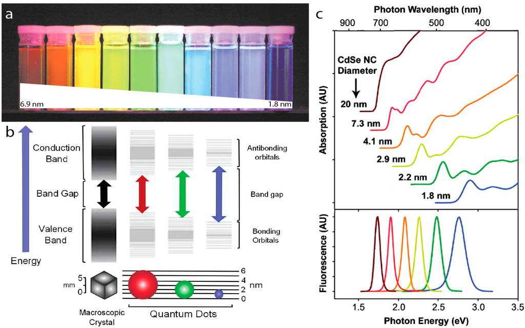(a) CdSe/ZnS core/shell QDs with CdSe core diameters ranging from 6.9 nm to 1.8 nm in diameter emitting with peaks from 1.9–2.8 eV (655–443 nm) from left to right under UV illumination. Adapted with permission from [20]; (b) Bandgap energy increases as the nanocrystal size decreases. Reprinted with permission from [38]; (c) Absorption (top) and emission (bottom) spectra of CdSe quantum dots. Reprinted with permission from [39]. Copyright (2010) American Chemical Society.