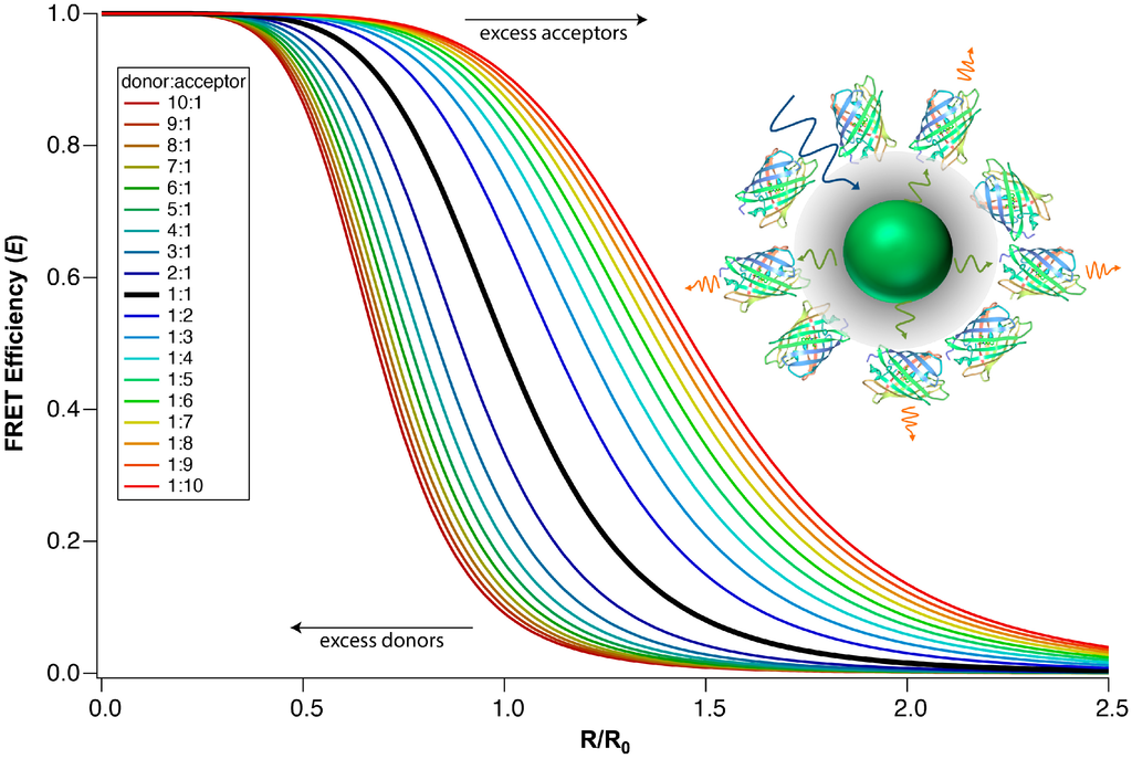 where n is the number of acceptors per donor. Intuitively, as more acceptors are present, more energy transfer pathways are available, and the probability of de-excitation via FRET becomes greater. Experimentally, it has been clearly shown that the FRET efficiency in QD-dye and QD-FP FRET systems scales with respect to Equation (2) when the donor-acceptor distance is held constant and the ratio of donor and acceptor molecules is varied [22,23,54]. Figure 3 demonstrates how an increase in the number of acceptors per donor increases the transfer efficiency. The impact of multivalency on FRET efficiency enables complex FRET systems to achieve a higher E than traditional single-donor-single-acceptor systems. Figure 3 also demonstrates that the transfer efficiency drops prodigiously if there are fewer acceptors than donors (i.e., n < 1).