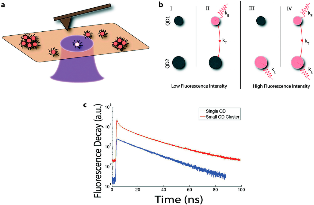 (a) Schematic of correlated fluorescence and atomic force microscopy on single QDs and QD clusters; (b) Schematic of possible emission and energy transfer schemes accounting for independent blinking (on/off states) of a QD donor (QD1) or acceptor (QD2); (c) Time-resolved PL of a single QD and a small QD cluster. Schematics are not drawn to scale. Reprinted with permission from [77]. Copyright (2010) American Chemical Society.