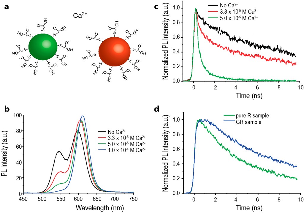 (a) Schematic of two-color QD-QD FRET Ca2+ sensor. Green donor CdTe QDs and red CdTe acceptor QDs are each coated with thioglycolic acid (TGA), imparting a negative surface charge. In the presence of the calcium cation, the QDs aggregate, bringing them in close enough proximity for energy transfer to occur efficiently. Schematic is not drawn to scale; (b) The PL spectrograph shows a decrease in the green donor emission and increase in the red acceptor emission with increasing calcium cation concentration; (c) Time-resolved PL of the green emission with increasing amounts of calcium; as the cation concentration increases, QD-QD interactions are promoted. The donor emission lifetime visibly shortens, indicating that the green QDs are acting as FRET donors; (d) Time-resolved PL of deep red emission from red-only and green-and-red-mixed QD samples. In the presence of the green donor QD, the PL lifetime of the red emission is elongated; (b–d) reprinted with permission from [76]. Copyright (2008) American Chemical Society.