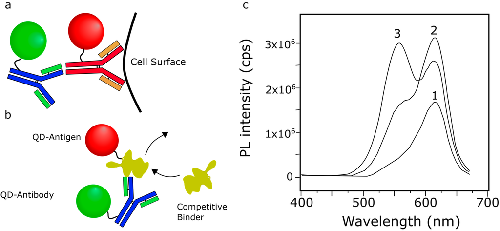 Several biosensors make use of FRET between heterogeneous QDs via analyte-induced aggregation of colloidal QDs. By cleverly selecting the capping ligand of QDs, QDs may specifically aggregate in the presence of a particular chemical or biomolecule. The clustering of QDs causes the PL spectra to shift, indicating the presence of the analyte. For example, the negative charge of the molecule trinitrotoluene (TNT) interacts with the positive charges on terminal amino groups, causing aggregation of QDs capped with amino-terminal PEGs. Shiraki et al. used this property to demonstrate a QD-QD FRET-based TNT sensor (Figure 10), reporting a 5 pM detection limit [101]. Because clustering depends on the charge of the TNT molecule, other molecules with similar charge distributions like 2,4-dinitrotoluene and 2-nitrotoluene also induce QD aggregation, albeit less effectively, yielding a lower limit of detection for TNT than for the analogues. This report shows extremely subtle changes in the PL spectra and the time-resolved PL lifetimes for the donor and acceptor QDs, indicating poor FRET efficiencies, but they did quote a lower limit of detection than an alternative competitive assay for TNT based on QD-dye FRET (5 pM vs. 88 nM) [102]. It may be that the exceptionally high brightness of both the donor and acceptor moieties in QD-QD FRET enable one to detect relatively fewer binding events, thereby lowering the limit of detection compared to other FRET sensor designs. The antibody-based binding of the QD-dye system, however, clearly holds the advantage in terms of specificity.
