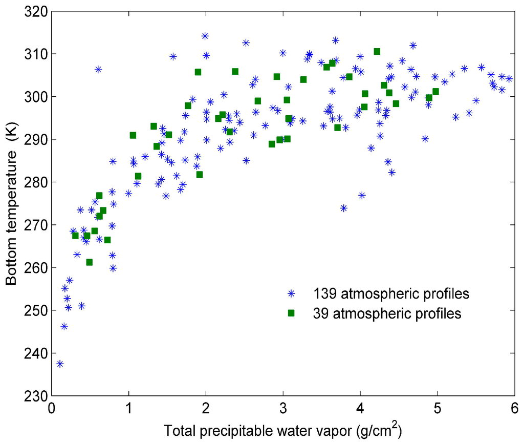 We have selected typical profiles from the Thermodynamic Initial Guess Retrieval (TIGR) database for simulation [38,39] in two steps. First, we have classified the 2311 clear-sky TIGR profiles into six groups according the concentration of water vapour. The total precipitable water-vapour ranges of the six groups are between 0 and 1 g/cm2, between 1 and 2 g/cm2, between 2 and 3 g/cm2, between 3 and 4 g/cm2, between 4 to 5 g/cm2, and between 5 and 6 g/cm2, respectively. After that, we have randomly selected nearly 23 profiles from each group to make sure the selected profiles were representative. Each atmospheric profile has 40 layers from 1013 hPa to 0.05 hPa. The air mass types for the selected atmospheric profiles are tropical, temperate, cold temperate and summer polar, cold polar, and winter polar types. The total precipitable water vapours of the selected atmospheric profiles range from 0 g/cm2 to 6 g/cm2. The variation of bottom temperature with the total precipitable water vapour for the 139 atmospheric profiles is presented in Figure 1. The method for determining clear-sky atmospheric profiles from the TIGR database has been detailed by [40].