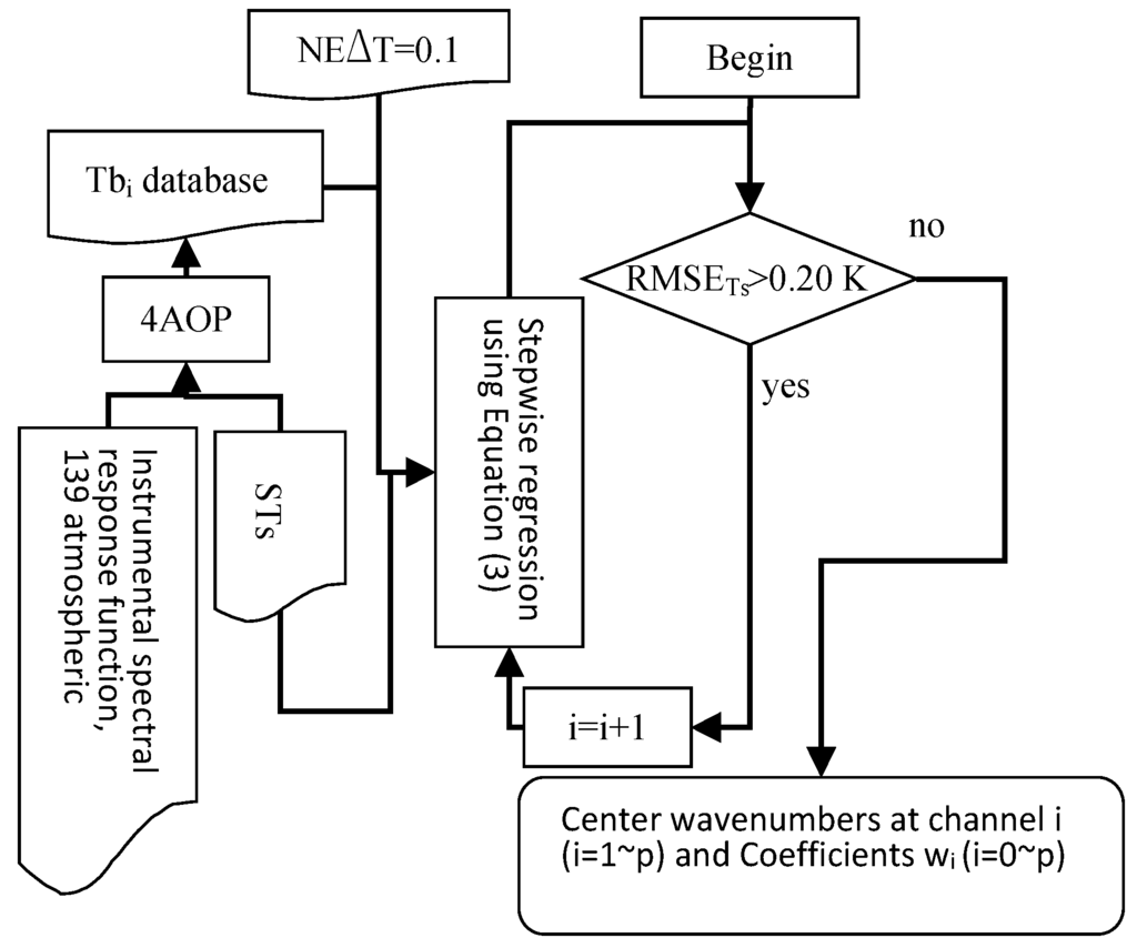 We have used the stepwise regression method with the simulation data to determine the centre wavenumbers at channel i and coefficients wi in Equation (3) for IASI. The procedure is shown in Figure 2.