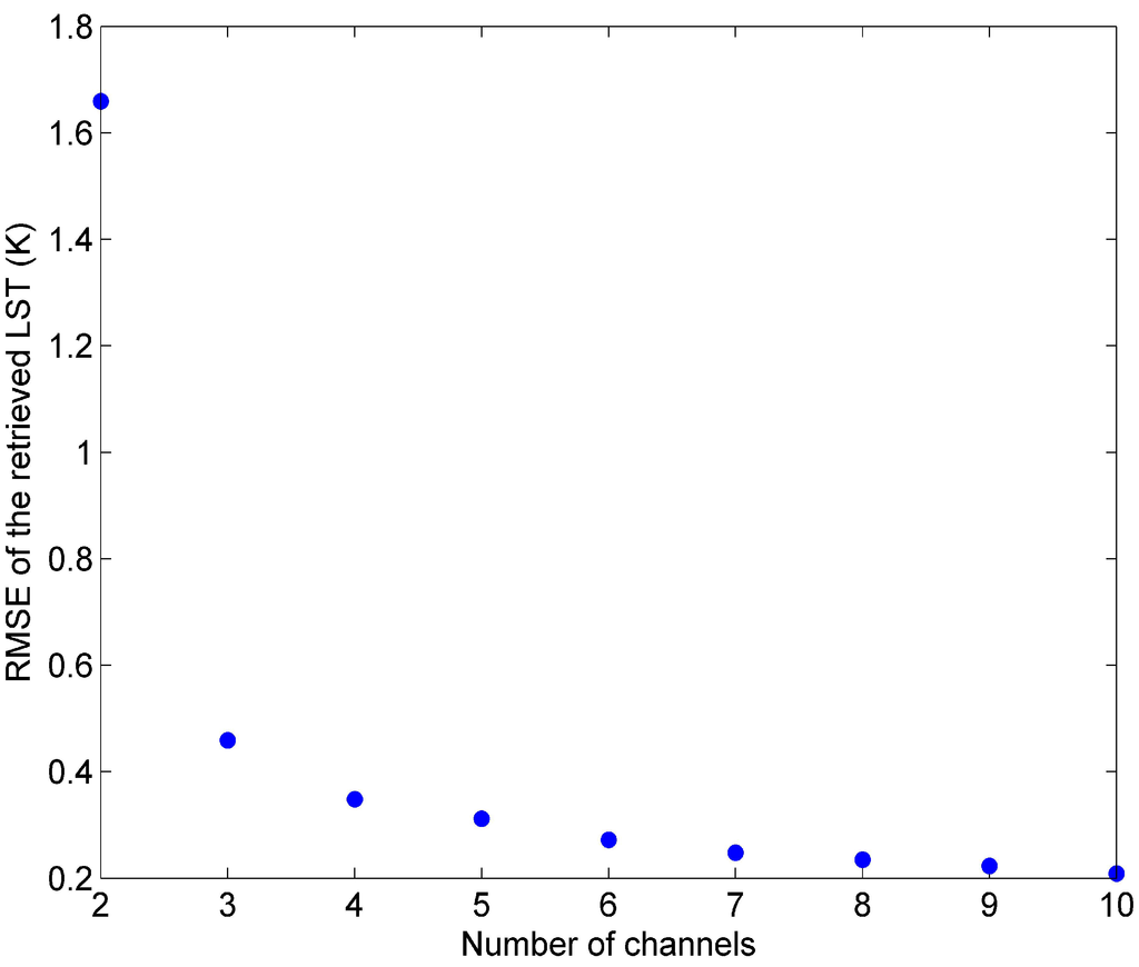 The variation of RMSE of the retrieved ST with the number of channels in the process of determining the centre wavenumbers of channel i and the coefficients wi is shown in Figure 3: the error of the ST that is retrieved using the corresponding regression equation with the simulation data above decreases with the growing number of channels, and the RMSE of the retrieved ST is less than 0.2 K when the number of channels is larger than 10.