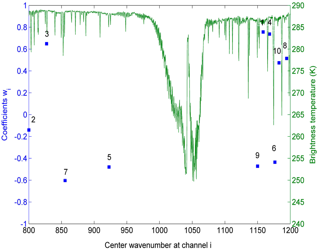 The centre wavenumbers of channel i (i = [1,p]) and the coefficients wi are shown in Figure 4. From this figure, we can see that the centre wavenumbers correspond to the wavenumbers where water vapour absorption is weak. The reason may be that the assumption that ST can be expressed as a linear function of p HypTIR brightness temperatures is more reliable at these wavenumbers. The Figure 4 also shows that all the coefficients wi are varying in a relatively small range between: −0.80~0.80.
