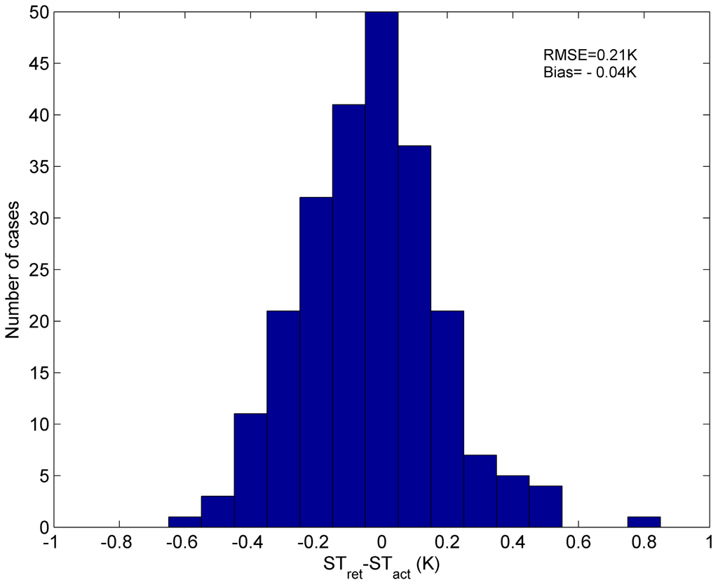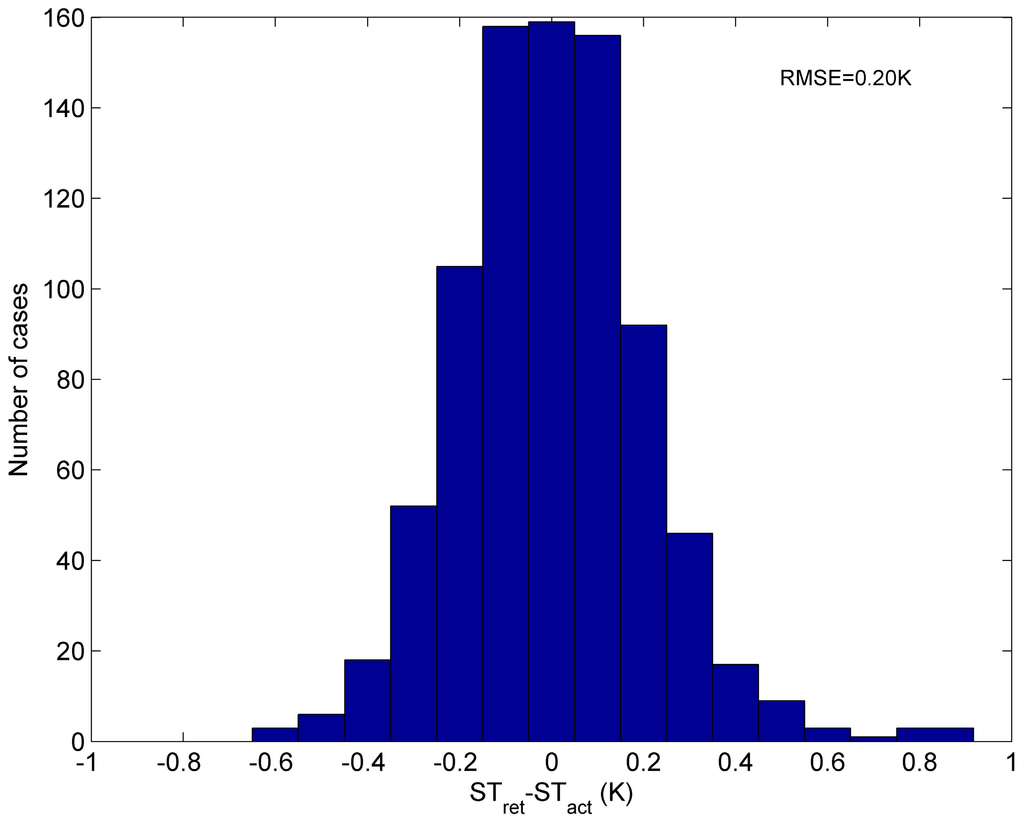 The error of ST retrieved from this independent simulation data is shown in Figure 6. The RMSE of ST retrieved by Equation (3) is 0.21 K. Our method is quite accurate and promising.
