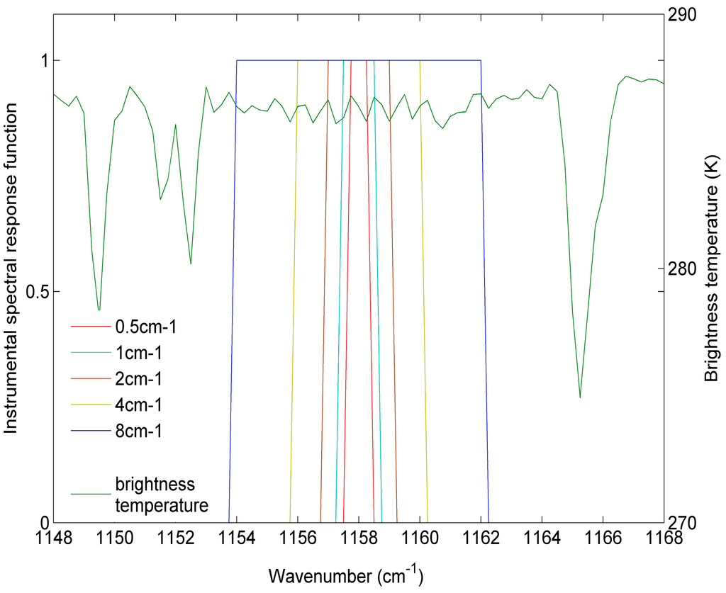 To refit the coefficients wi, we have created five simulation databases for five HypTIR sensors with spectral sampling frequencies = 0.5, 1, 2, 4, 8 cm−1. We assumed that the five sensors have 10 channels with the centre wavenumbers shown in Figure 4. The instrumental spectral response functions (ISRFs) for the five sensors are rectangular impulse functions. The ISRFs for the five sensors at one channel are shown in Figure 7. The simulation database for each of the five sensors is resampled from the simulation data mentioned in Section 2 using each ISRF. The coefficients wi refitted for each spectral sampling frequency are shown in Table 1.