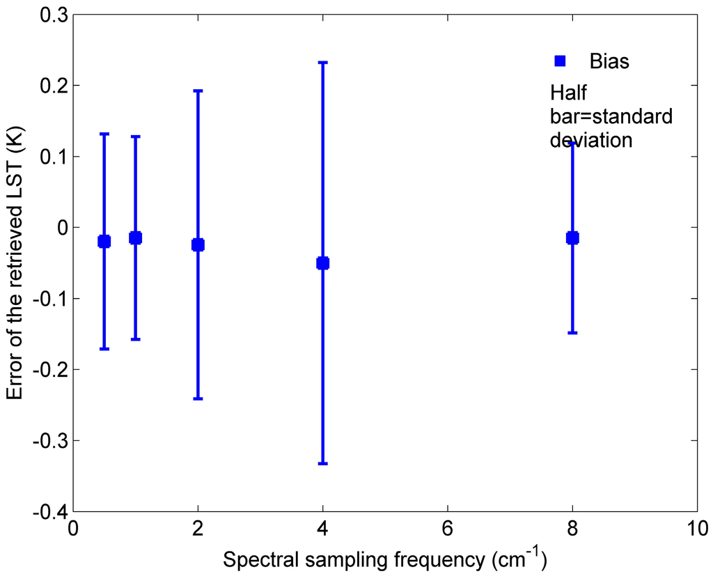 We have analysed the sensitivity of the method to spectral sampling frequency by refitting the coefficients wi in Equation (3) for each spectral sampling frequency, using five simulation databases and studying the error of ST retrieved using these refitted coefficients wi from five other independent simulation databases.