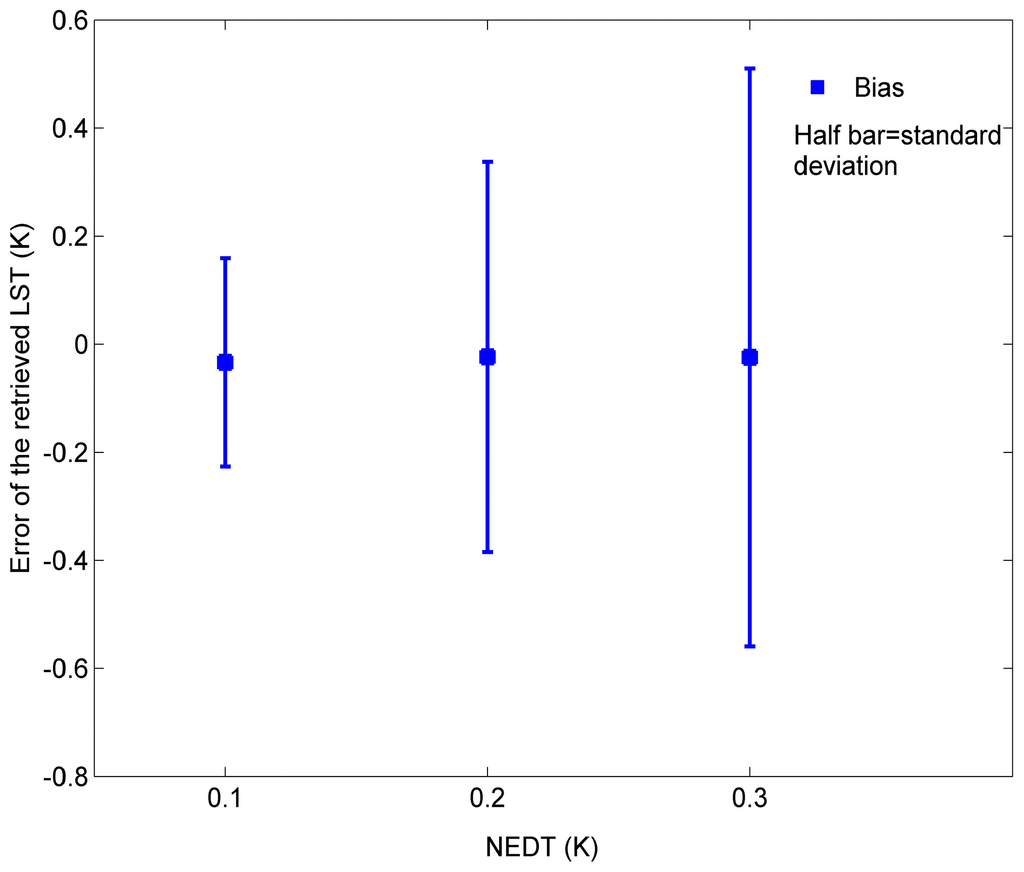 With NE∆T instrumental noise growing from 0.1 K to 0.3 K, the standard error of the retrieved ST goes from 0.19 K to 0.53 K. Therefore, the impact of instrumental noise on the accuracy of the ST retrieved by Equation (3) is of the order of magnitude of the instrumental noise.