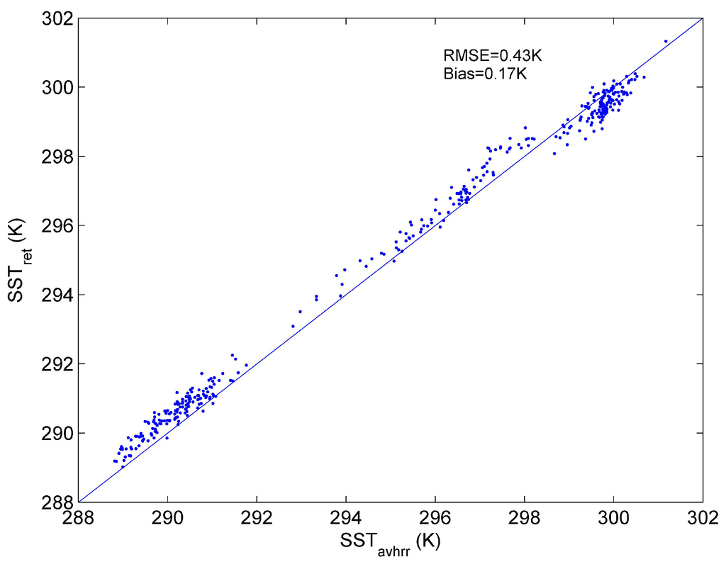 The Advanced Very High Resolution Radiometer (AVHRR) on the same satellite has two thermal infrared channels centred at 10.8 μm and 12 μm. The level 2 sea surface temperature (SST) product form AVHRR with a spatial resolution of 1 km is used to validate the SST retrieved by our developed method. The SST product from AVHRR is retrieved using the split-window method. The algorithm for deriving this SST product can be seen in [45].