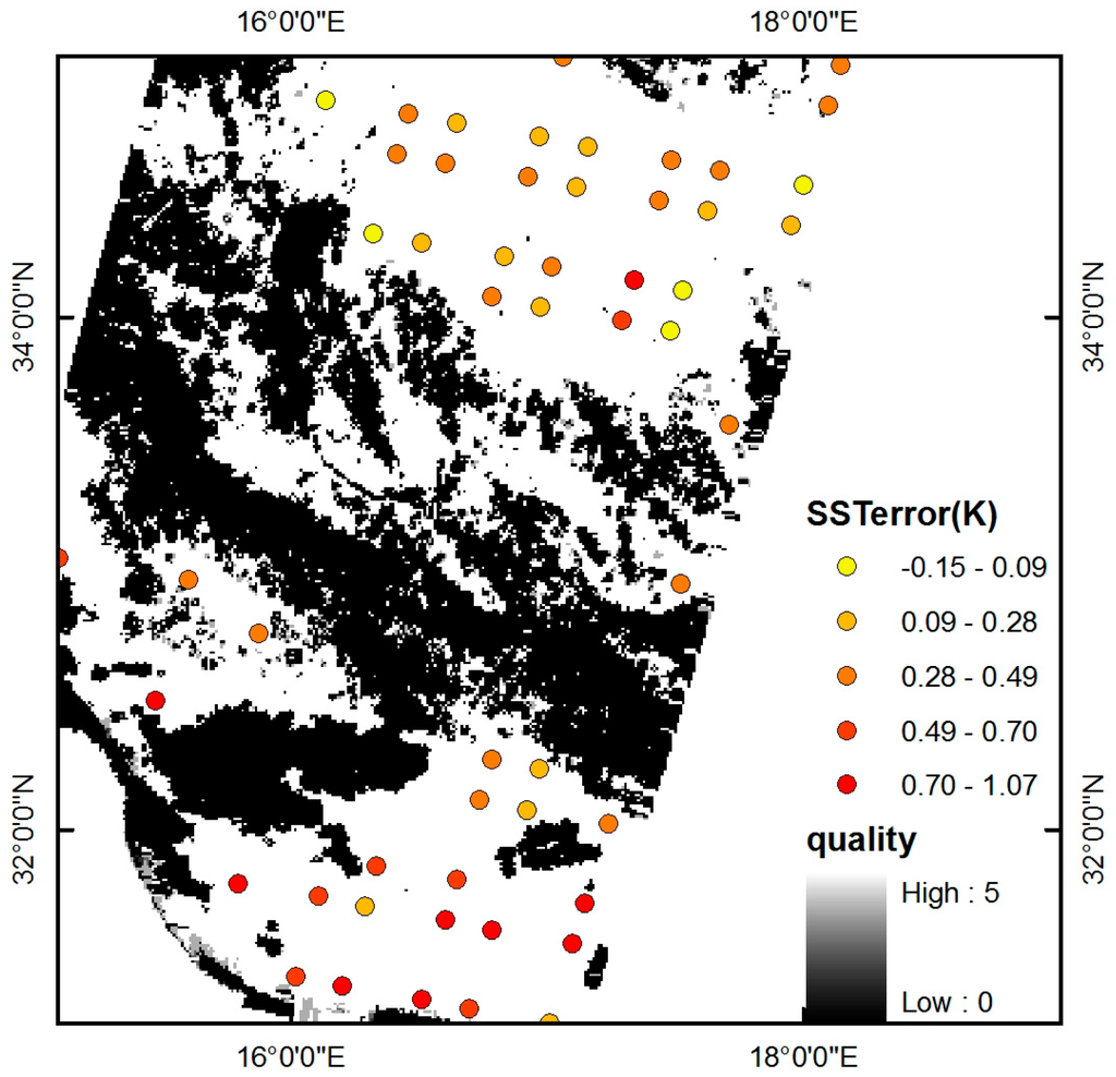 The spatial pattern of the ST error retrieved from the IASI image sensed on 4 November 2014 over part of the Mediterranean Sea is shown in Figure 12. The error of the retrieved ST is homogeneously distributed, and no important deviation is seen.