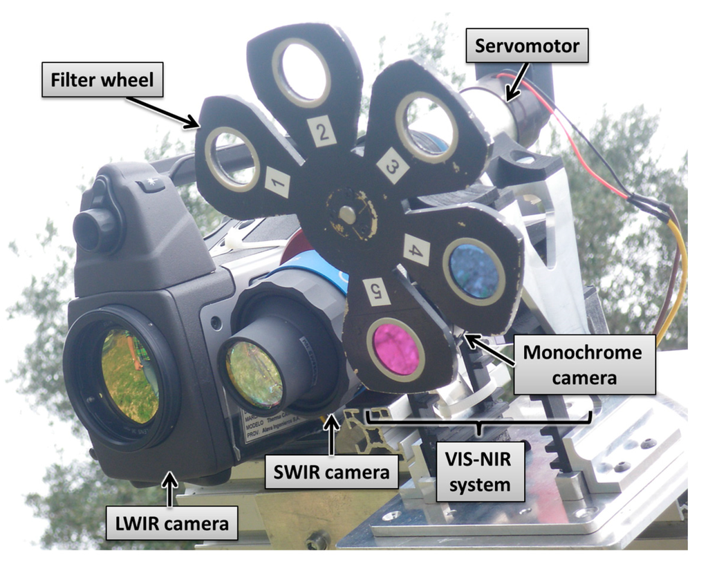 The proposed solution is based on the combination of a P25 LWIR camera (FLIR, Wilsonville, OR, USA) a GoldEye P-032 SWIR camera (Allied Vision, Stradtroda, Germany) and a VIS-NIR system that comprises an Allied Vision AVT Prosilica GC2450 high resolution monochrome camera, a custom-made filter wheel, and a servomotor that allows interchanging two band-pass optical filters with centre wavelengths of 624 nm and 950 nm (see Figure 1). The FLIR P25 LWIR camera has a spectral range that goes from 7.5 to 13 μm, a storage temperature range that goes from −40 °C to 70 °C, a thermal sensitivity of 0.08 °C at 30 °C and a resolution of 320 × 240 pixels. The GoldEye P-032 SWIR camera has a spectral response from 900 nm to 1700 nm thanks to its InGaAs sensor of 636 × 508 pixels. The AVT Prosilica GC2450 monochrome camera, which features the high quality ICX-625 CCD image sensor (Sony, Tokyo, Japan), has a frame rate of up to 15 fps at 2448 × 2050 pixels resolution.
