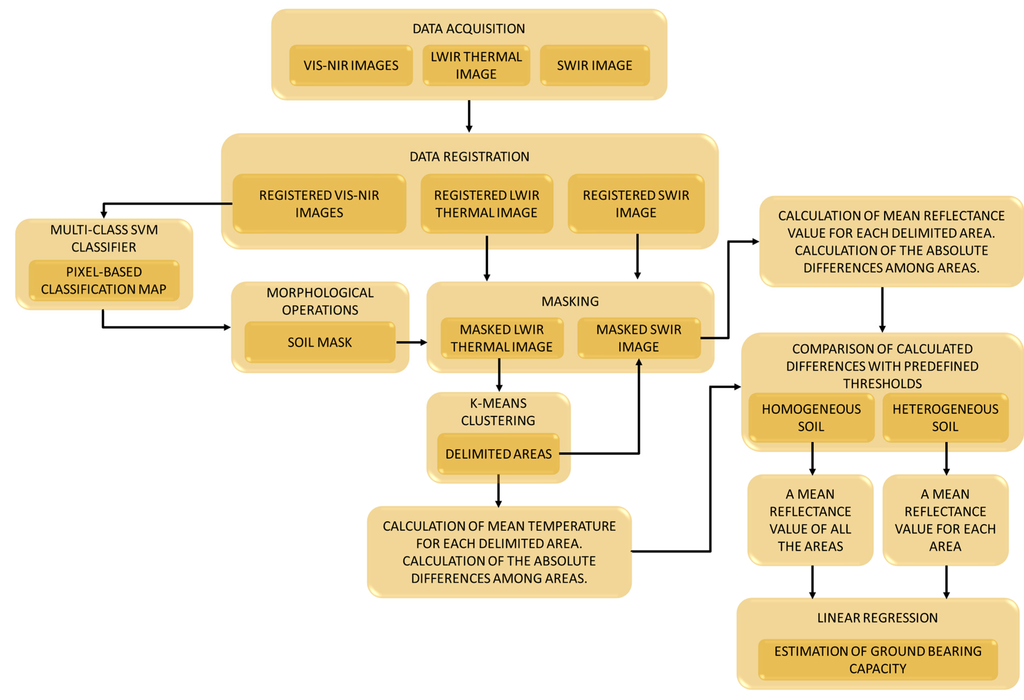 - A K-means clustering that is applied to the soil pixels of the masked thermal image with the aim of partitioning soil pixels into three effective clusters. These three clusters are then utilised for delimiting the areas where the mean temperatures and the mean reflectance values will be calculated from the thermal and the normalised SWIR images, respectively. Next, the absolute differences from the mean values of the clustered areas are calculated and compared with certain predefined thresholds that will help us to determine if the soil sample has a homogeneous bearing capacity, or if on the contrary, the soil is heterogeneous. If soil is homogeneous a unique mean reflectance value is calculated from the soil pixels of the normalised SWIR image. If the soil is heterogeneous, a mean reflectance value is calculated for each area of the normalised SWIR image. Delimitation of these areas is given by the clusters obtained from the masked thermal image after applying the K-means clustering.
