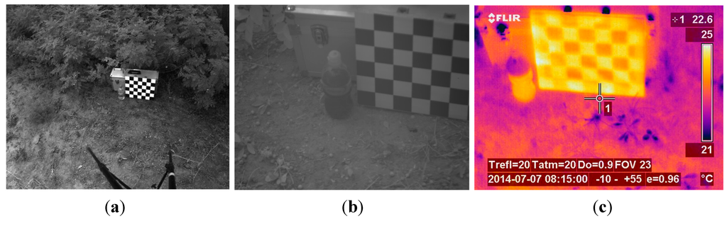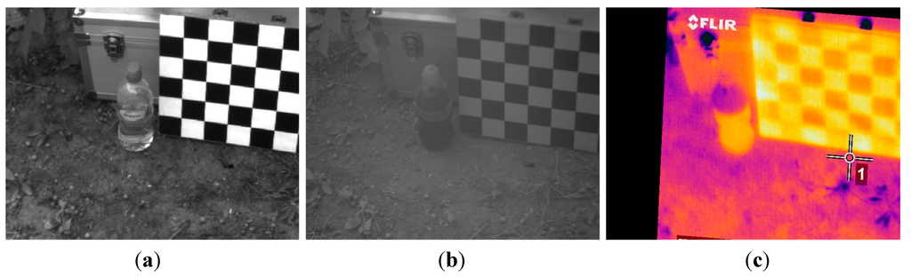Images utilised as inputs for the registration procedure. (a) Monochrome image acquired by the AVT Prosilica GC2450; (b) SWIR image; (c) LWIR thermal image.