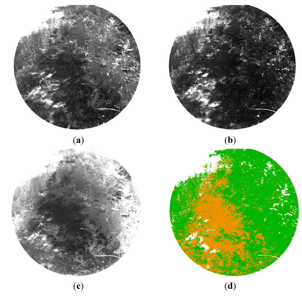 (a) Monochrome image; (b) 624 nm image; (c) 950 nm image; (d) Classification map.