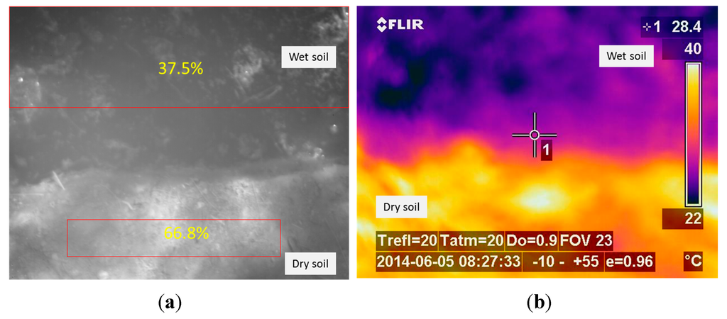 Once these areas of interest have been isolated, they are analysed on SWIR and LWIR images in order to study the surface soil moisture. Water strongly absorbs light in the SWIR wavelengths. This is due to overtones and fundamentals of the three vibration frequencies of H2O; symmetric and asymmetric O–H stretching and O–H bending [43,44]. Thus, the reflectance on SWIR images decreases with increasing soil moisture. LWIR thermal images, for its part, show a decrease in temperature in moist soil, in comparison with dry soil [39] due mainly to the evaporation that dissipates heat and the high heat capacity of the water. Nevertheless, there are several factors that can influence soil temperature such as the angle to the sun and the time of day. For that reason, LWIR information is just utilised for determining if the ground exhibits either a heterogeneous or a homogeneous moisture distribution.