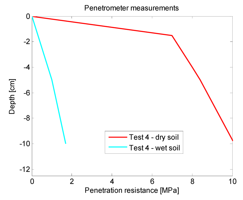 The third phase of the experimental stage was carried out with the aim of finding out a relationship between the data acquired with the SWIR camera and the measurements obtained with the penetrometer. Datasets included LWIR and SWIR images acquired in scenarios with dry and wet soil. Moreover, in each of the conducted experiments, several measures were also carried out with a penetrometer, so that the soil penetration resistance information can be associated with the corresponding mean reflectance value of the SWIR image acquired with the sensory rig, and in this way, be subsequently used for training the algorithms responsible of estimating the ground bearing capacity. An example of the data obtained in this phase is presented on Figure 7 and Figure 8. Figure 7a shows the normalised image acquired with the SWIR camera, while Figure 7b illustrates the corresponding LWIR image. Note that upper parts of these images correspond to wet soil and bottom parts to dry soil. Red boxes displayed on Figure 7a indicate the dry and wet areas of the soil that were selected not only for the calculation of the mean reflectance percentages but also for the measurement of the penetration resistances by using the penetrometer. Resulting mean reflectance percentages for the selected areas are also displayed in yellow. Figure 8 gathers the measurements acquired with the penetrometer for this test. Black and blue lines represent the penetration resistances measured at different depths when the soil is dry and wet, respectively.