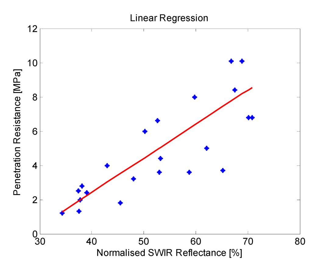 From the results obtained in all the tests carried out on this third phase it is possible to confirm that the mean reflectance values of the areas of interest belonging to the soil on normalised SWIR images decrease with increasing soil moisture, as it was expected, since water strongly absorbs light in the SWIR wavelengths. Thermal images also confirm a decrease in the temperature through the day when the ground is wet, in comparison with the dry soil. However, as we stated in the previous section, the direct utilisation of thermal information is discarded for the estimation of the ground bearing capacity, since there are several factors that influence soil temperature, including angle to the sun, weather conditions and the time of day. Even so, thermal information is very useful for other intermediate processing steps that help us to identify areas that are considerably wetter than the rest, providing automatic delineation of areas for the calculation of the mean reflectance values on normalised SWIR images. On the other hand, penetrometer measurements reinforce the idea that the penetration resistance, and therefore, the bearing capacity, decrease when the soil is moist. Taking into account these results, a linear regression approach is applied for modelling the relationship between the soil penetration resistance (at a depth of 0.1 m) and the corresponding mean reflectance value of this region of interest on a normalised SWIR image. Figure 9 illustrates the linear regression carried out with the data obtained from the experimental tests.