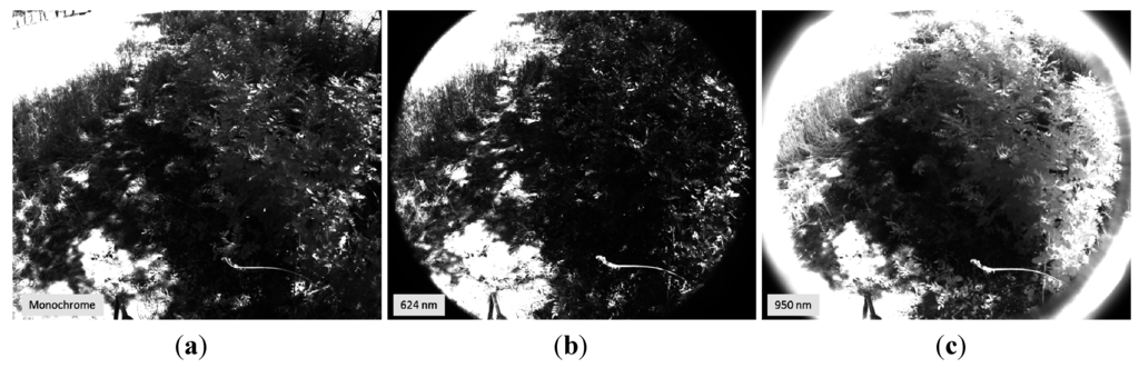 (a) Monochrome image; (b) 624 nm image; (c) 950 nm image.