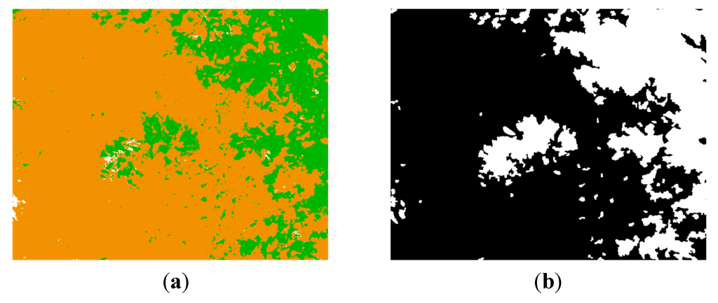Figure 18 shows the images obtained after applying the registration procedure. Figure 19 presents the map resulting from the multi-class SVM classifier and the mask generated from this classification map.