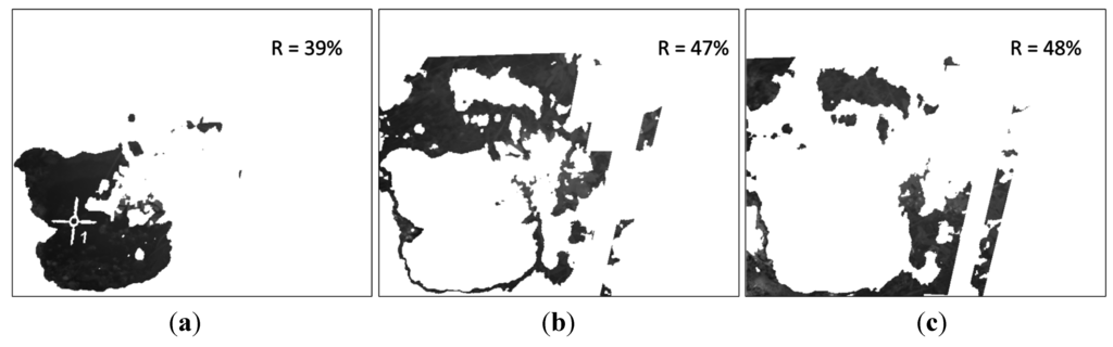 Delimited areas and mean reflectance percentages on the normalised SWIR image. (a) First cluster; (b) Second cluster; (c) Third cluster.