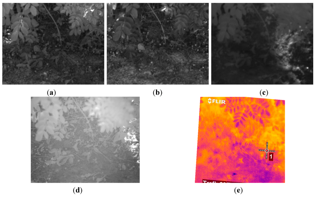 Registered images. (a) Registered monochrome image; (b) Registered 624 nm image; (c) Registered 950 nm image; (d) Registered SWIR image; (e) Registered LWIR image.