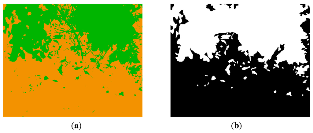 The pixel-based classification map resulting from applying the multi-class SVM classifier to the images presented in Figure 12a–c is shown in Figure 13a. Note that in spite of the challenging scene, the multi-class SVM classifier exhibits a very successful performance. This map is then utilised for generating a mask, in such a way that only pixels classified as soil are considered on thermal and normalised SWIR images for the further processing steps. Thus, Figure 13b displays the mask generated from the classification map and after the application of some morphological procedures to fill holes and remove small objects.