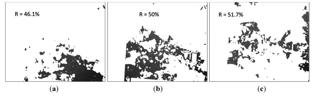 Next, the K-means clustering is applied to the pixels of the LWIR thermal image that remain after conducting the masking, with the aim of partitioning these pixels into four exclusive clusters. Every pixel in the image is labelled in accordance with the cluster index assigned by the K-means procedure. Cluster corresponding to white pixels is disregarded, since it does not belong to the soil class. Figure 14 shows the three effective clusters resulting from the K-means procedure. These three effective clusters are then utilised for delimiting the areas that are employed for calculating the mean temperatures and the mean reflectance values on the thermal and the normalised SWIR images, respectively. Figure 15 displays the corresponding delimited areas on the normalised SWIR image.