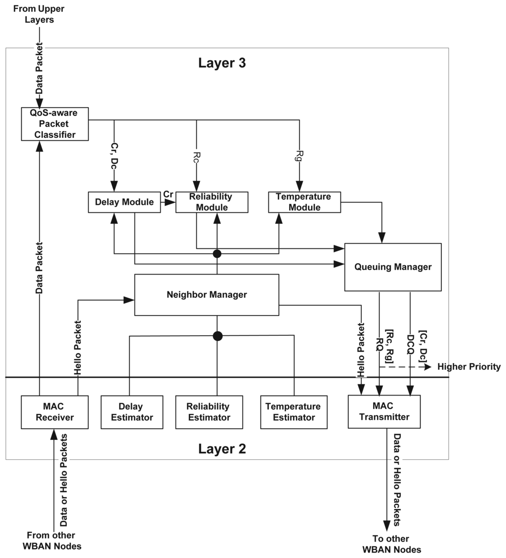 Considering delay and reliability as the primary QoS constraints, a module is devoted to each of these constraints as depicted in Figure 2. The temperature module deals with the regular packet, (no delay and reliability constraints) and ensures that the packet reaches to the BC with a lower temperature route. The QoS-aware packet classifier classifies the packet according to their QoS demands and passes it to the respective module for further processing. The neighbor manager module runs the HELLO protocol that enables exchanging information among neighboring nodes, and maintains a neighbor table. This module interacts with delay estimator, reliability estimator and temperature estimator modules in layer-2 for acquiring the respective parameter values of a node. Upon exploiting the parameter values, the neighbor manager builds the HELLO packet. It also passes the neighbor table information to the delay module, reliability module and temperature module respectively to locally select the most appropriate neighboring node among the available candidates. The queuing manager module maintains two queues namely, Delay Constrained Queue (DCQ) and Regular Queue (RQ), and implements priority multi-queuing strategy that provides differentiated priority for diverse traffic types.