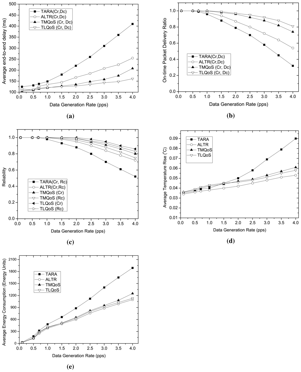 As the traffic load increases, the energy consumption also increases in all the protocols as illustrated in Figure 4e. Similar to the temperature rise, ALTR also shows the best performance in energy consumption. The reason is that, although ALTR has lower reliability than QoS-aware protocols but it involves less number of nodes in packet transmission that affects the lower average energy consumption of the nodes. The higher reliability and shorter hop-count path selection also causes to achieve lower energy consumption of QoS aware protocols. Although at low traffic load, TMQoS shows a bit better energy consumption than TLQoS, however, TLQoS outperforms TMQoS at high traffic load due to its superior performance in reliability at that traffic condition. TARA, having poor reliability performance and spreading the packets along more nodes in the network due to withdrawal strategy, exhibits the worst energy consumption performance among all the protocols.