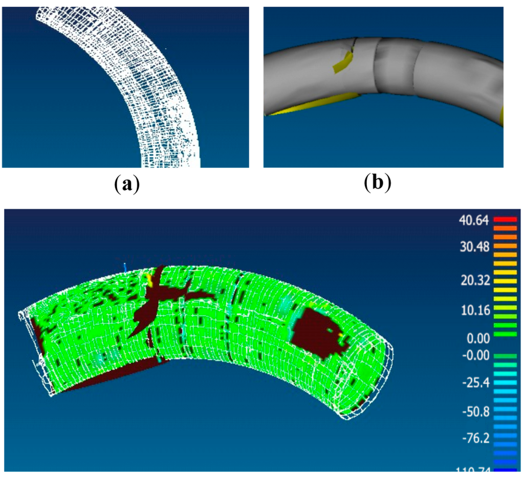 To validate that these devices are not suitable for shape measurement, we performed an experiment with a laser tracker to obtain the surface geometry data of a pipe with a diameter of 690 mm, a total length of 1875 mm and a bend curvature radius of 3200 mm. It took 6 h in all to obtain 50 thousands 3-D points, as shown in Figure 1a. However, the surface reconstruction, as shown in Figure 1b, has obvious distortions and the maximum error is up to 110.74 mm, as shown in Figure 1c. These errors are mainly attributed to the sparse data. Therefore, it is difficult for single point devices to be used in the field of surface high-density measurement.